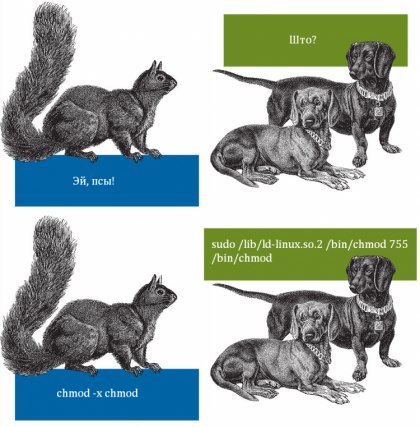 The comic reads: "Hey doggos!" -- "Whot" -- "chmod -x chmod" -- "sudo /lib/ld-linux.so.2 /bin/chmod 755 /bin/chmod" ↩︎